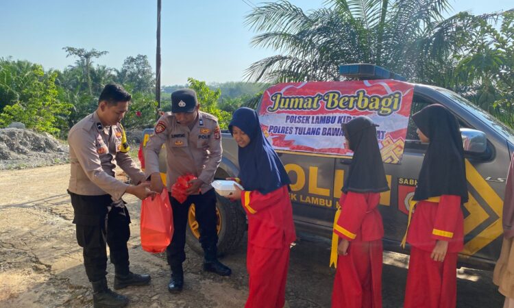 Tulang Bawang Barat–7Menit.com-Dalam semangat berbagi di hari Jumat yang penuh berkah,Personil Polsek Lambu Kibang, Polres Tulang Bawang Barat Polda Lampung membagikan nasi kotak kepada Santri Pondok Pesantren Nurul Kirom Tiyuh Gunung Sari Jaya Kec. Lambu Kibang Kab.Tubaba, Jumat (05/09/2025). Pagi