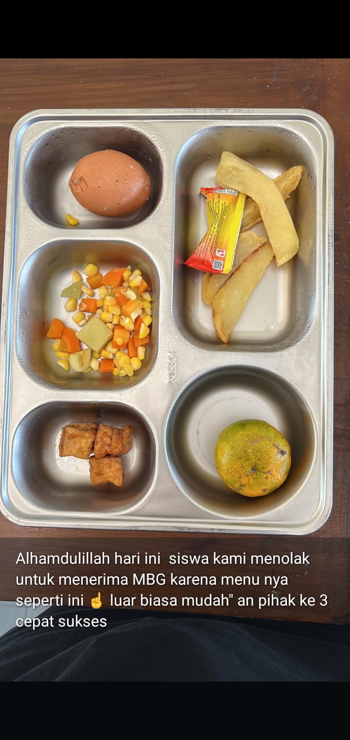Tak berhenti di situ, sehari sebelumnya, Kamis 25 September 2025, Firman juga mengunggah sebuah video yang memperlihatkan menu serupa. Dalam tayangan itu tampak jelas isi makanan: buah pir yang dibelah empat, satu potong tahu, sayuran campur nangka, tauge, dan jagung, sejumput ayam suwir, serta nasi. Ironisnya, potongan pir yang dibagikan diduga dalam kondisi busuk.