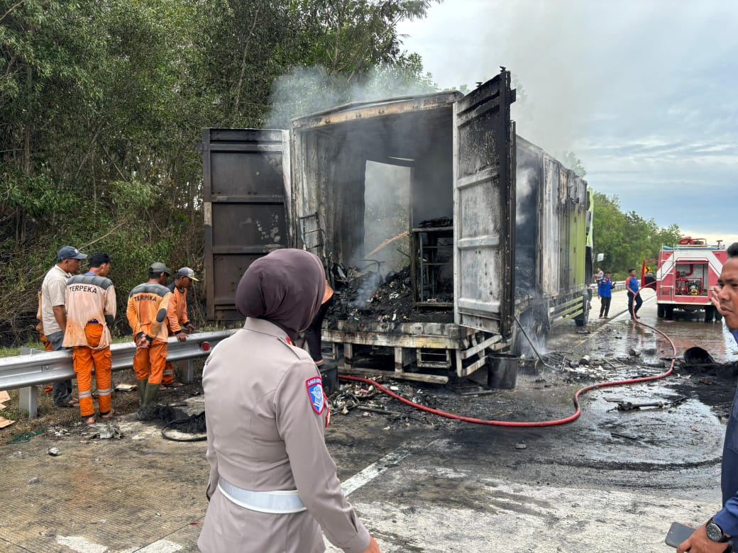 Tronton Hino Euro empat Terbakar di Tol Terpeka, Satlantas Polres Tulang Bawang Barat Lakukan Gerak Cepat Amankan Lalu Lintas
